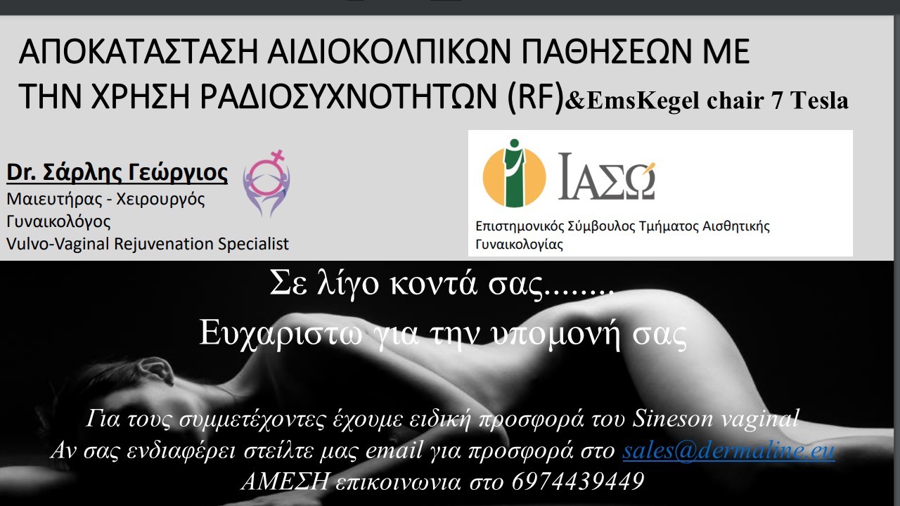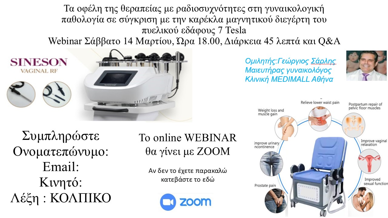 Με μεγάλη μας χαρά σας προσκαλούμε Δευτέρα 14 Μαρτίου 2026 στις 18.00 να συμμετάσχετε στο διαδικτυακό σεμινάριο με τίτλο ΤΑ ΟΦΕΛΗ ΤΗΣ ΘΕΡΑΠΕΙΑΣ ΡΑΔΙΟΣΥΧΝΟΤΗΤΩΝ ΣΤΗ ΓΥΝΑΙΚΟΛΟΓΙΚΗ ΠΑΘΟΛΟΓΙΑ (για την αποκατάσταση της κολπικής ξηρότητας, ακράτεια ούρων και αιδιοκολπικών παθήσεων)